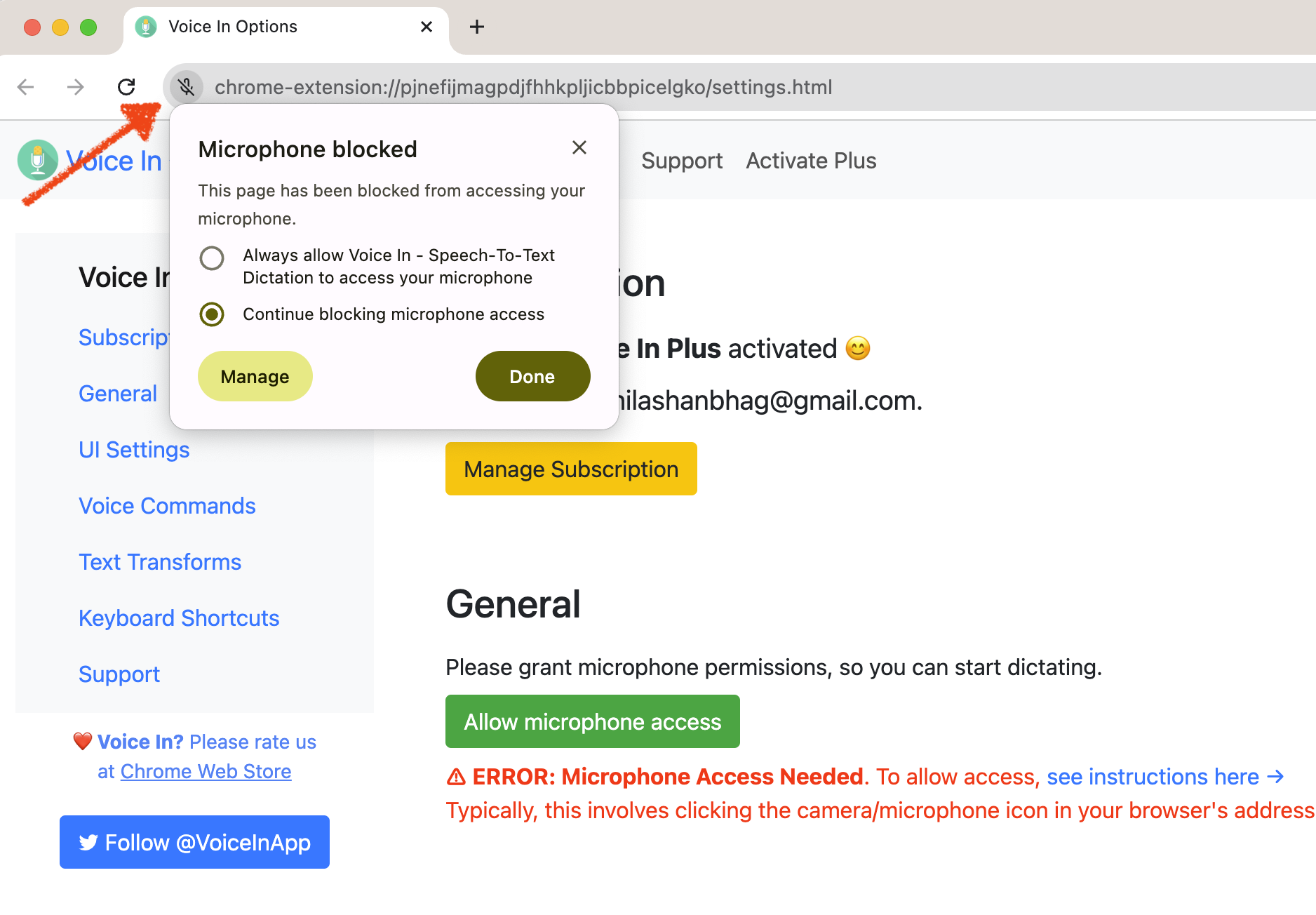 If your microphone access is blocked to Voice In, follow one of the two methods below to grant microphone access.