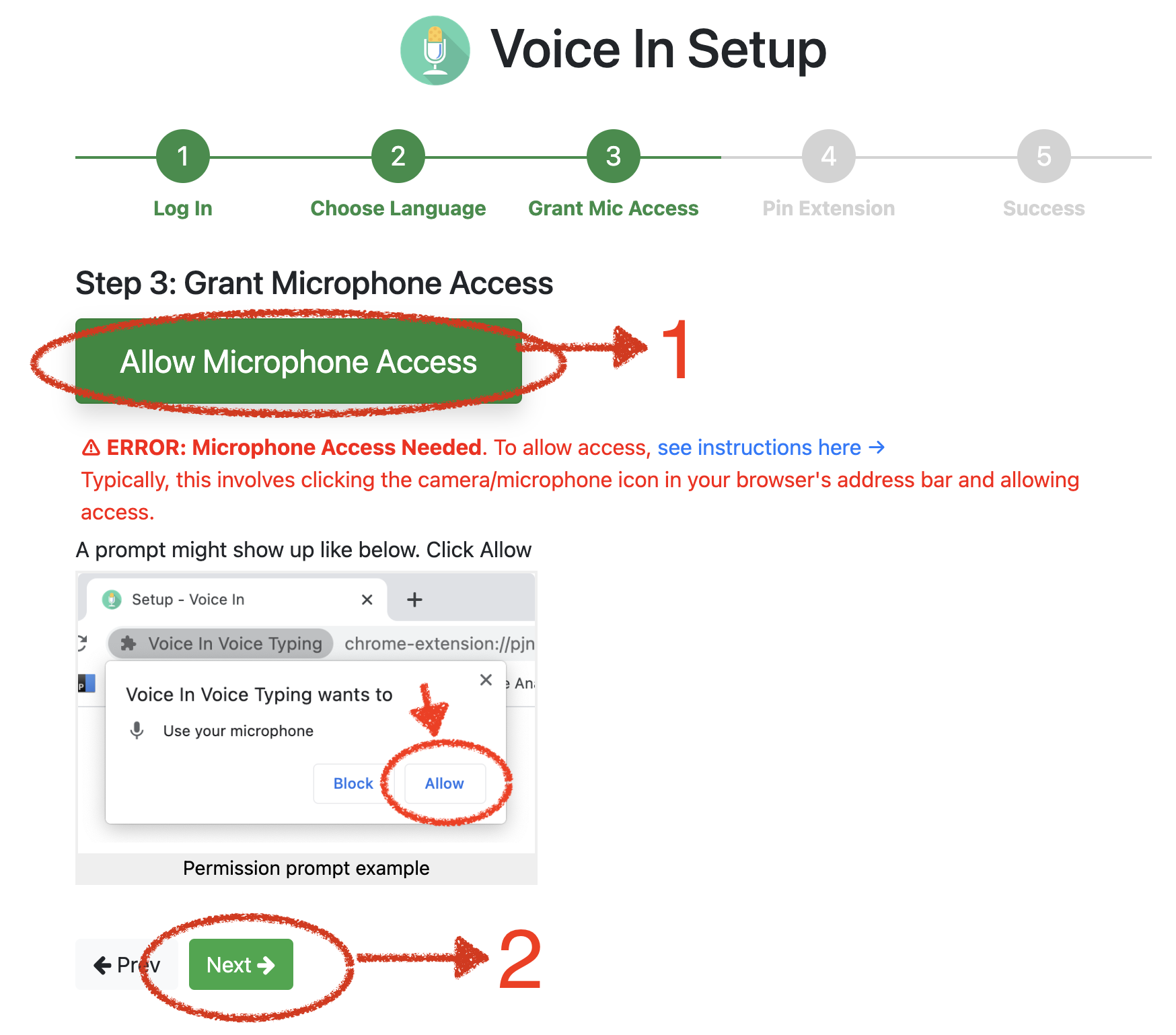 If you are on the Setup Page, click on **Allow Microphone Access**. Then click on **Next**.&#x20;