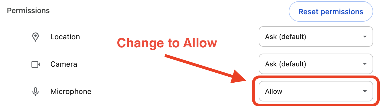 Change the Microphone setting in Permissions to **Allow** as shown below.